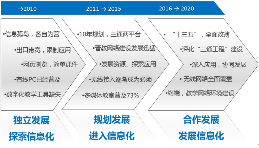 “深入推进“三通工程”:基本实现各级各类学校宽带网络全覆盖与网络教学环境建设,优质数字教育资源服务基本满足信息化教学需求…推进“无线校园”建设: 东部和具备条件的城镇各类学校要实现无线网络全覆盖;鼓励具备条件的学校配备师生用教学终端“——《关于“十三五”期间全面深入推进教育信息化工作的指导意见》。