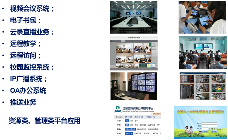 从实践上来看,普教城域网包括为互联网及教科网出口、各校园区覆盖和接入、两大基础平台(资源和管理)以及数据中心基础设施、云计算平台等,包含的业务或系统主要有: